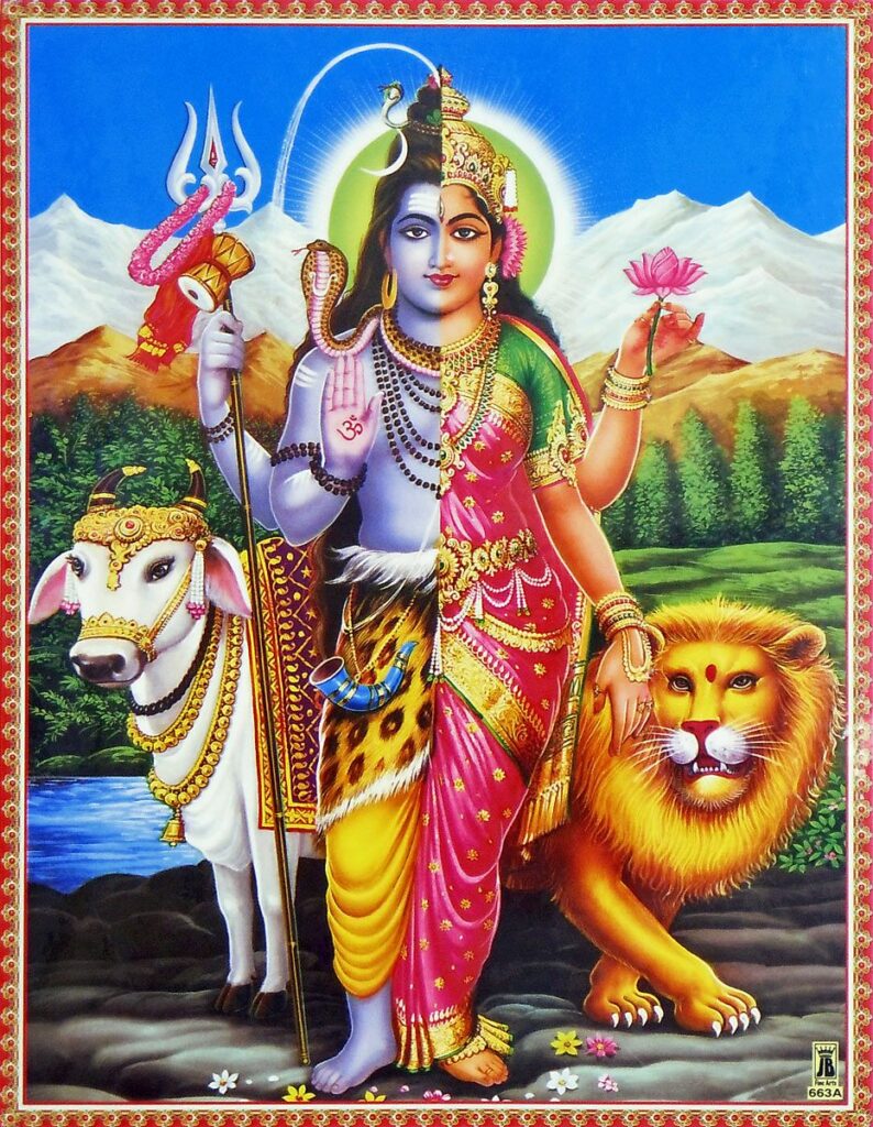 Ardhanarishvara stands in a shining white lingam, the colour of brilliant light. The male half of Ardhanarishvara has camphor-blue skin. He holds a trident in his right hand, representing the three aspects of consciousness: cognition, will, and affection.