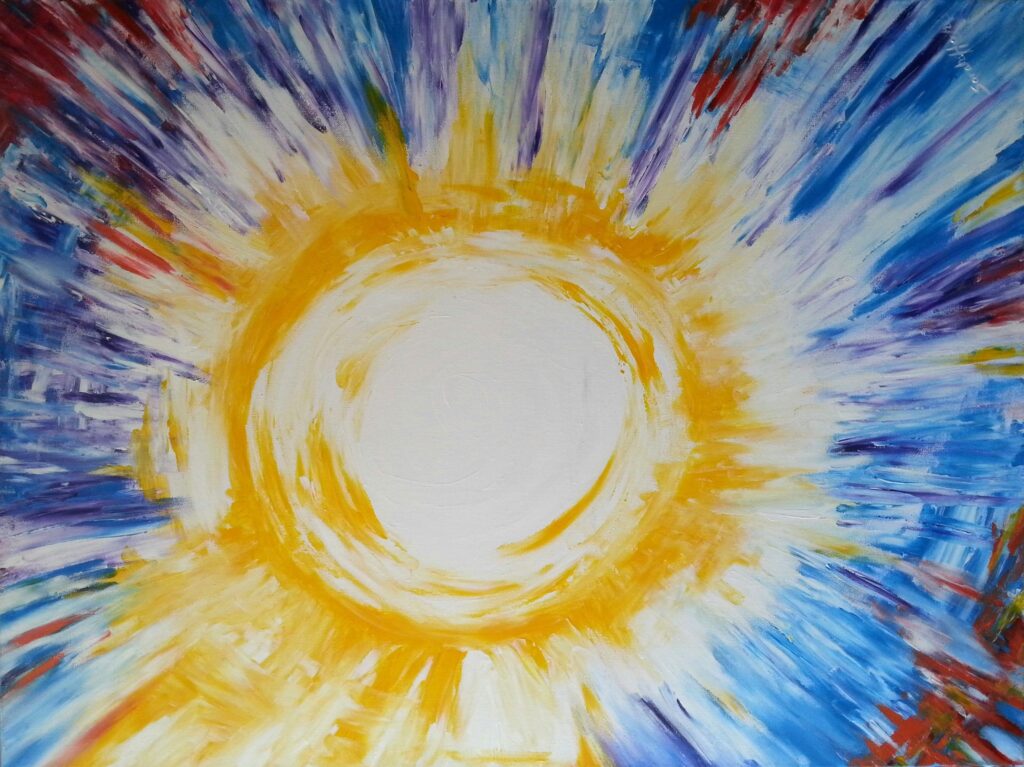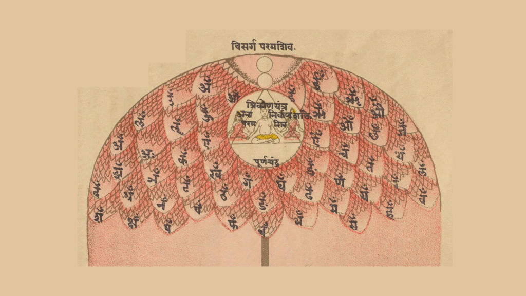 This thousand petaled lotus is down-turned, lustrous and whiter then the full moon, tinged with the color of the young sun. Within it is the full moon, perfectly white, resplendant as in a clear sky. Its rays shine, moist and cool as nectar. Within the moon, constantly shines like lightning, the triangle, and inside this again shines the Great Void. The Supreme Light is formless and the Bindu is imperishable.