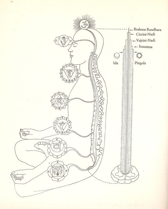 At the beginning of spiritual awakening, the lotus in the chakras are turned downward. As Kundalini Shakti rises up the Susumna Nadi the lotuses turns upright and bloom, signifying the descent of divine grace.