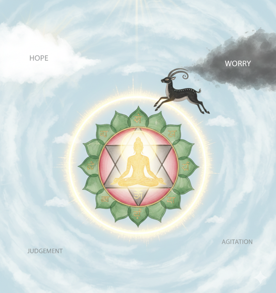 Imagine the heart as a clear sky. Hope is a white cloud, and Worry is a dark cloud. Both are “disturbances” to the clarity of the sky. When the wind of meditation blows all 12 clouds away, only the Anahata (the unstruck, eternal silence) remains.