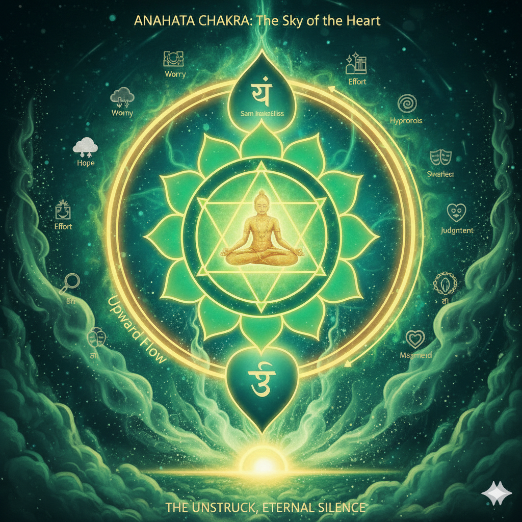 Shifting our perspective from “emotions” to “disturbances” aligns us with the ancient Tantric physiology of the heart. The Anahata is the seat of Anahata Dhwani — the “Unstruck Sound.” It is the sound of absolute silence, the vibration of the soul itself.