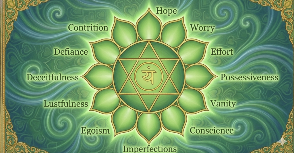 The mind is a vibration of energy— a miniature expression of the cosmic flow. To manifest this energy, the consciousness adopts Vrittis: mental modifications that act as whirlpools or disturbances in our internal field. In the Anahata (Heart) Chakra, these are symbolized by 12 lotus petals, each representing a specific frequency of human experience: hope, consideration, effort, universal love, sincerity, awareness, agitation, egoism, greed, hypocrisy, judgementalism and contrition.
