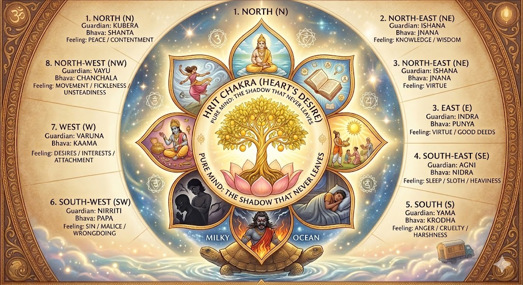 It is located just below Anāhata and above Muladhara. The vrittis of Hrit Chakra aren’t essentially whirling emotions, they are more like states of mind. While Anahata is about the emotional fluctuations of the heart (the 12 Vrittis like hope/greed), Hrit is about the spiritual orientation of the soul. These eight, golden petals represent the eight directions and eight-fold nature of the soul’s potential to project its consciousness out into the universe to manifest the heart’s desire.